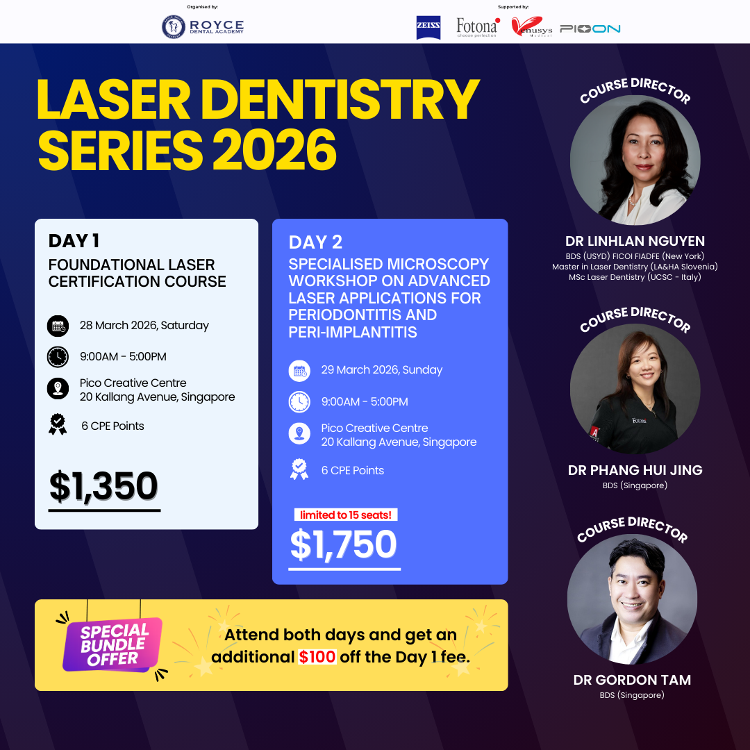 Hands-on workshop that provides attendees with essential understanding of laser physics, laser‐tissue interactions, and characteristics of various laser wavelengths utilised in dentistry for hard and soft tissue treatment, important laser safety knowledge and laser regulation in Singapore. General discussion and comparison of various laser dental applications from basic to advanced treatments using diodes and hard tissue laser will be conducted before hands-on session.