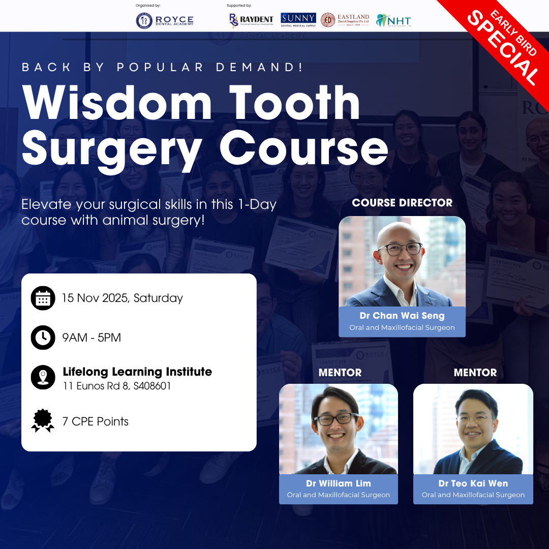 Course Overview: This 1 day course with animal surgery is designed for dental practitioners who have prior or no experience in wisdom tooth extraction. Includes post course 1-on-1 mentorship guidance by certified Oral & Maxillofacial Surgeons at Smileworks Surgical Suite in Paragon Medical Centre. Cases will need to be pre-screened to determine suitability. More details on enquiry.